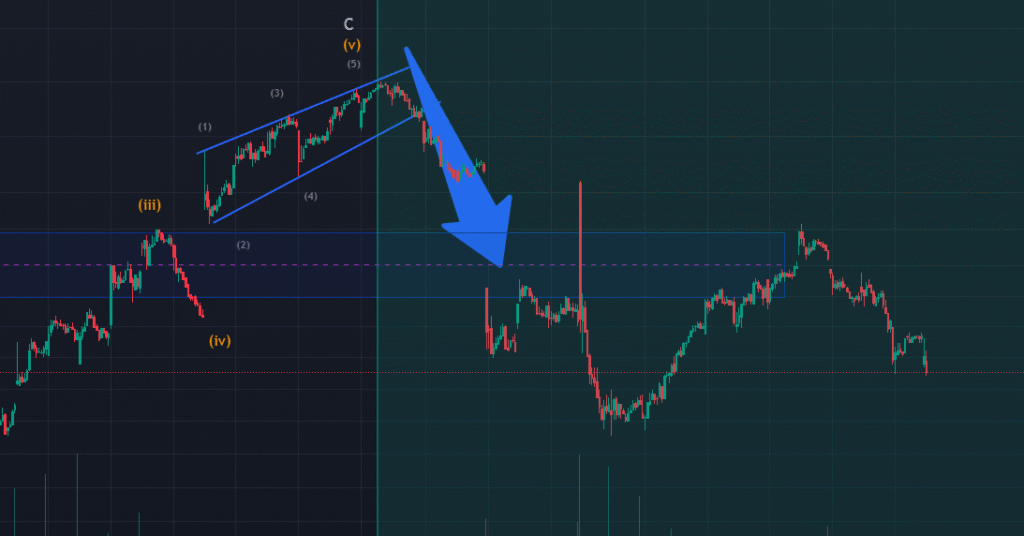 Watch for confirmation of breakdown. Fake breakouts above channel top are common in wave (5) endings. Entry valid only below lower trendline.